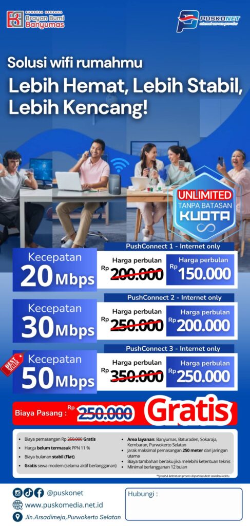 Puskonet adalah penyedia layanan internet (ISP) terpercaya di Purwokerto, Kabupaten Banyumas. Kami menawarkan koneksi internet cepat, stabil, dan unlimited untuk rumah, UMKM, hingga perusahaan. Dengan dukungan teknisi berpengalaman dan layanan pelanggan ramah, Puskonet siap menjadi solusi internet terbaik di wilayah Purwokerto, Kabupaten Banyumas.